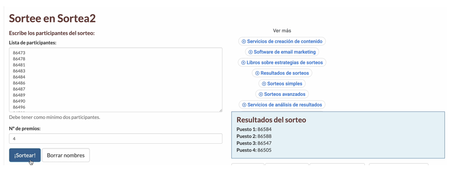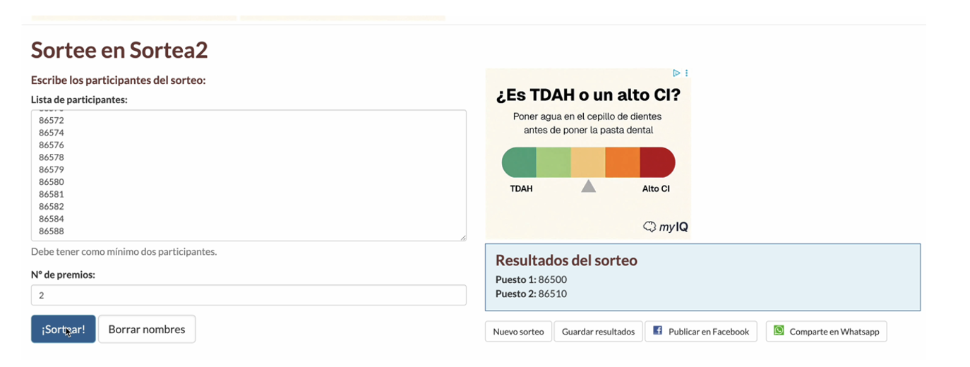 Imagen realizada desde la página web de sortea2 donde aparecen los ganadores
