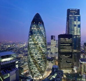Es uno de los edificios más altos de Londres y su compleja estructura requirió de complejas fórmulas matemáticas para prevenir el impacto de los torbellinos que se forman en su base, ya que el “pepinillo” como es conocido, consume la mitad de la necesidad energética que un edificio del mismo volumen. La construcción está totalmente revestida por una malla de triángulos de acero que soportan y desvían la presión del viento. Su forma ha sido diseñada por un programa de última generación, que calcula las presiones horizontales que cada piso ha de soportar.